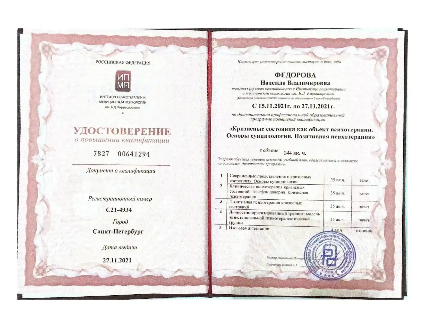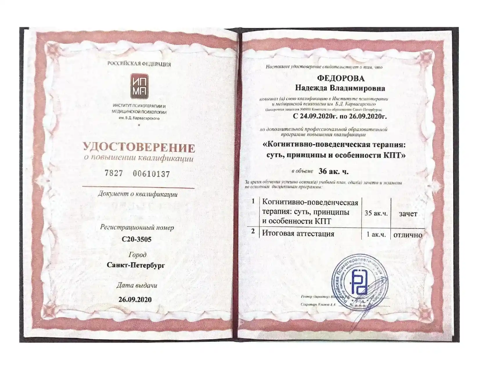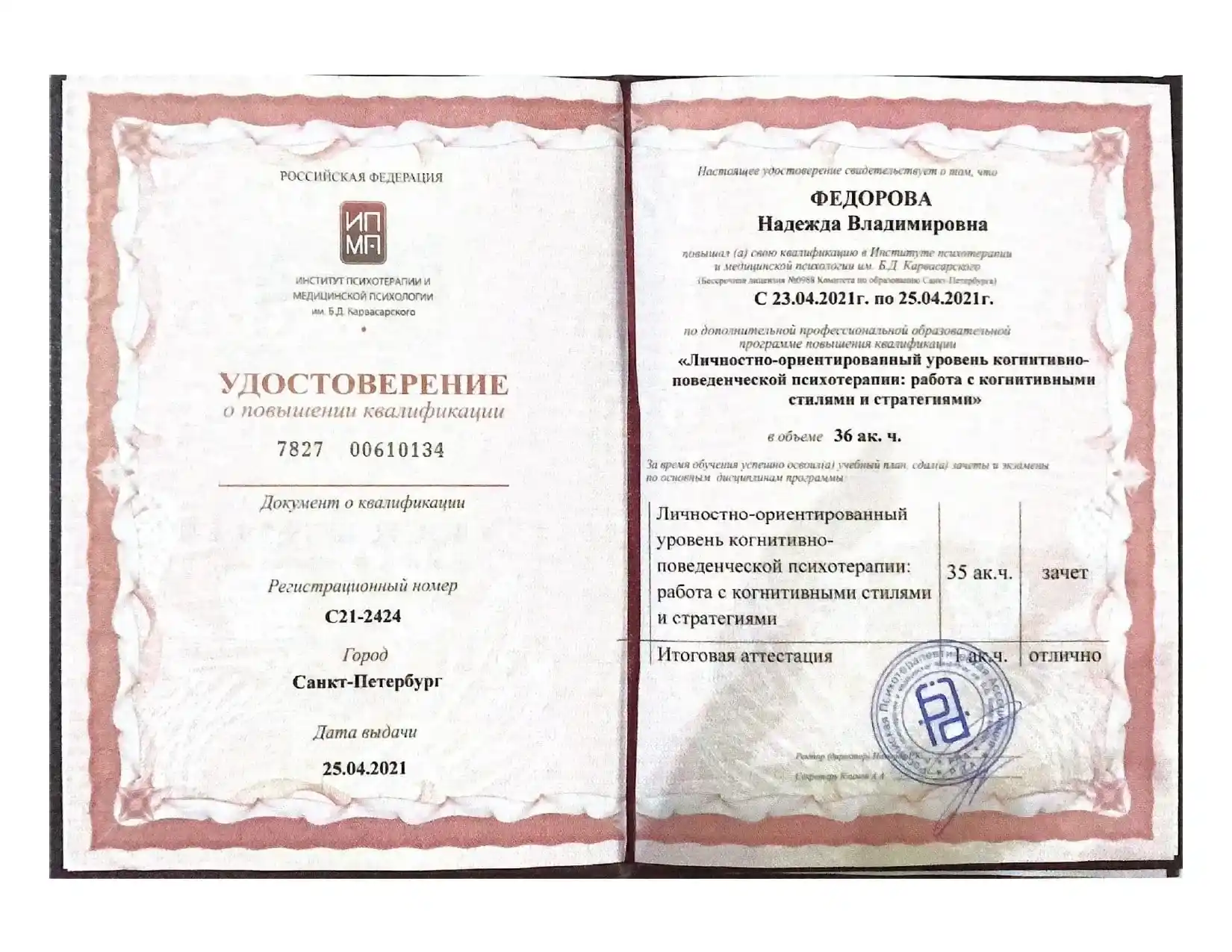 - В 2014 году получила диплом по Личностно-ориентированному уровню когнитивно-поведенческой психотерапии. Работа с когнитивными стилями и стратегиями.