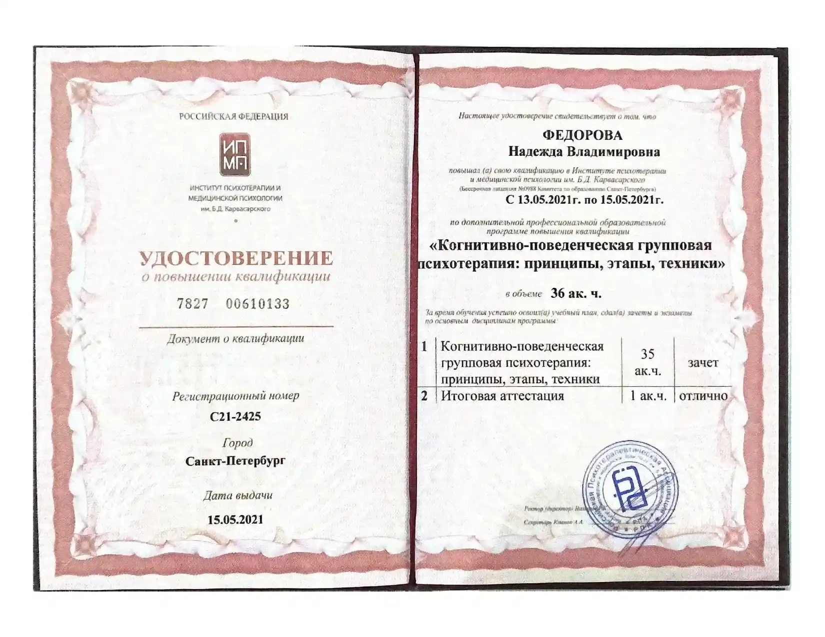 - Повышение квалификации Клинико-психологической диагностики и интервенции. Когнитивно-поведенческая групповая психотерапия, принципы, этапы, техники.
